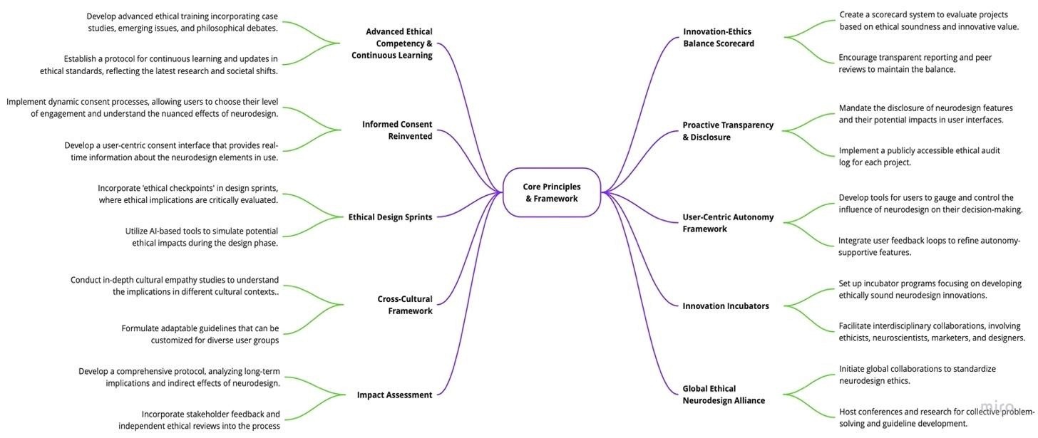 To tackle the issues raised by the requirement for thorough ethical standards in neurodesign, I suggest a specific framework designed specifically for product developers, marketing directors, and designers in mind. It is intended to serve as a guide for these experts as they develop products that, at different phases of development, conform to ethical neurodesign principles.